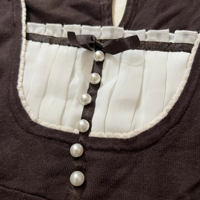 Harajuku Grunge T-shirt Women Korean Preppy Style Kawaii Bow Crop Top Vintage Patchwork Square Collare Puff Sleeve Milkmaid Top